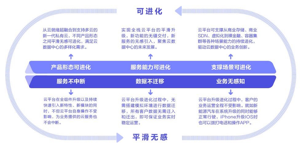 可進化是新一代私有云的核心特性,通過軟件和硬件的解耦,通過軟件定義硬件,實現(xiàn)軟件可進化、硬件可換代,真正長期釋放云平臺的價值